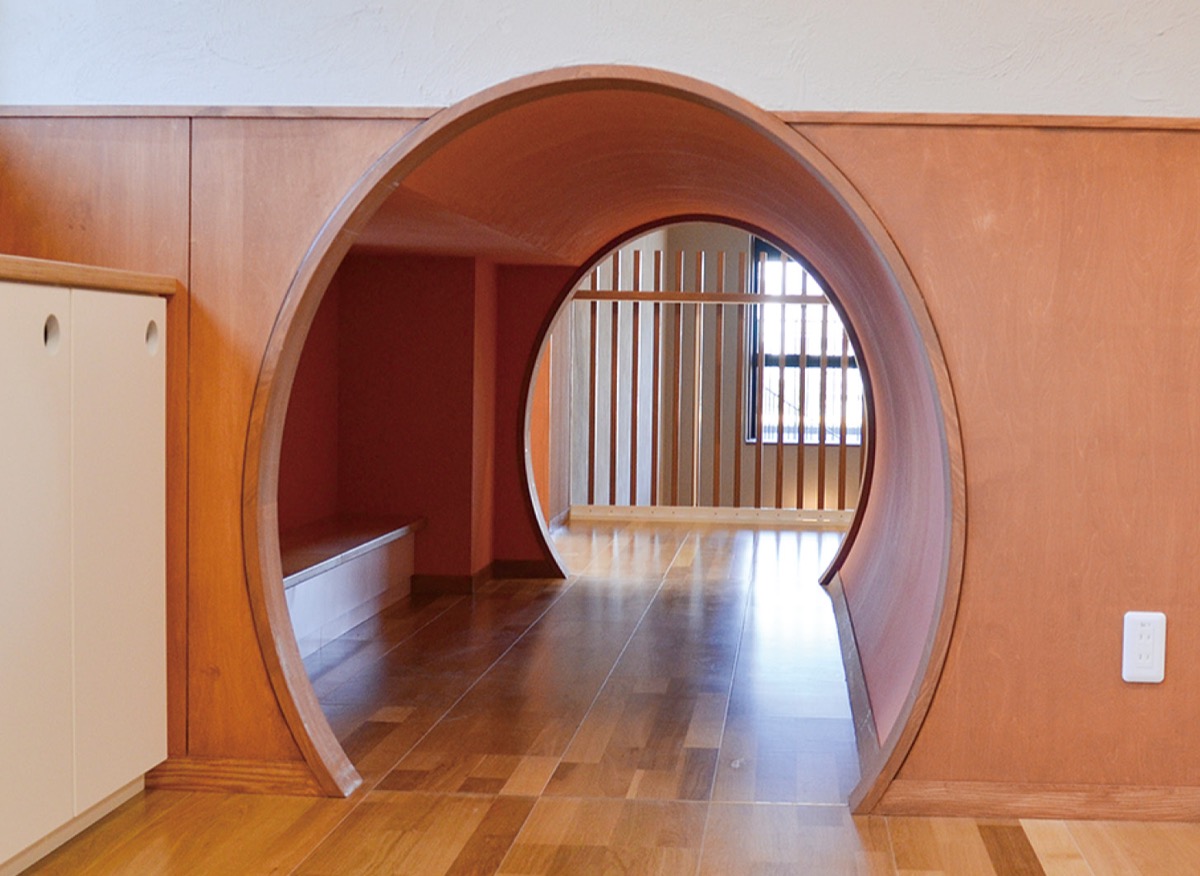 1500平方メートルの敷地に建てられた園舎は鉄骨造3階建て。園児を迎える登園口は吹き抜けの広々した空間で、各保育室には扉がなく開放的な雰囲気だ。部屋と廊下を結ぶトンネルや穴倉のようなスペースなど、園児の遊び心をくすぐる仕掛けも随所に施されている。