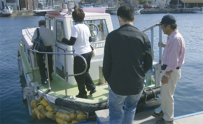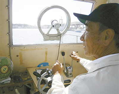 「観光と城ケ島に住む人たちの交通手段として渡船の運行を始めた」と、再開のきっかけを話す同社の宮川明久さん。三崎港と城ケ島までの乗船時間は片道約5分。料金は、大人200円、子ども100円。1959年(昭和34)は、往復20円(ラーメン1杯が30から40円)。現在、三崎と島を1日平均20往復している。震災前は年間約4万人の利用があった。震災以降減ったが、今年に入り戻りつつあるという。燃料は、食用廃油を原料としたバイオディーゼルを使用。利便性向上を目的に両岸に呼び出しボタンを設置、利用者の呼び出しに応じて運行している。船も運行方法も半世紀という時代の流れとともに進化した。