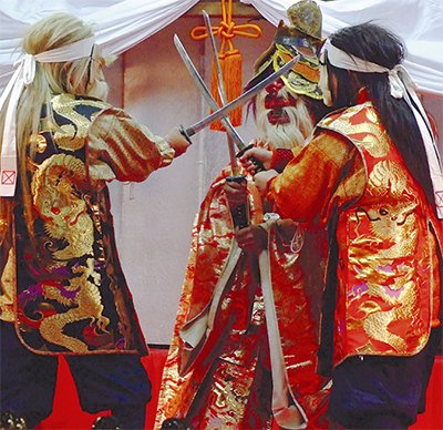 三浦市三崎の海南神社に伝わる市指定重要無形民俗文化財「面神楽」が11月7日(水)・8日(木)、同神社(三崎4の12の11)神楽殿で奉納される。毎年、11月初めの申酉の日の夜に大太鼓、締太鼓、笛の囃子に合わせ神楽殿で10演目が演じられる。