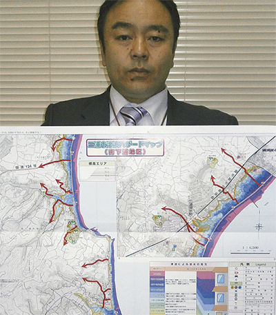 マップは、初声地区、南下浦地区、三崎地区の3地区に分け作製。それぞれマップの逆面には、市民から要望のあった市全図の浸水状況を載せている。市は6月に防災情報を載せた避難マニュアルを作製している。市危機管理課は「新たに作製したハザードマップと避難マニュアルをセットで保存して欲しい。また、機会があるごとにマップを見て、いざというとき、自分がどの方向に逃げるべきかを頭に入れておいて欲しい」と話している。