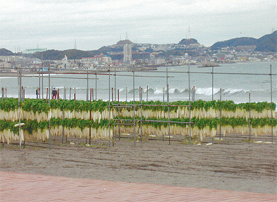 金田に至る旧道沿いに、名号塔と共に案内板のある所を右折して進みますと、左側に葬祭場の「いちょう会堂」が在り、さらに進むと大きな槇の木と公孫樹が植えられています。正面に本堂が見えます。公孫樹の下に「まかせ由緒」の立札が見えます。「まかせ」とは、鰯漁(いわしりょう)で使う網のことで、一度にたくさんの魚を獲る巻網漁法のことで、その名の由来は大きな網を曳くときに「ヨイトマカセ」の掛け声を上げるということからきているのだそうです。江戸時代、三代将軍家光の時、寛永年間(1624〜1643)に紀州和歌山から伝わったというのです。当時上方(かみがた)(大阪を中心とした)で、棉(めん)の肥料として干鰯(ほしか)の需要が増え、漁場を求めて関東へと進出してきたとのことで、浦賀では「干鰯問屋」が栄えていたと言われています。その後、当地と紀州との往来が増し、この地へ来た漁師を網になぞらえて「まかせ」と呼ぶようになったという話です。その漁師たちの墓と言われています墓石があります。その年号を見てみますと、古い順に「元文」「宝暦」「安永」「文化」とあり、2基は不明で、6基の墓があります。さらに、その一区画に、天保15年(1844年)造立の「海上殉難(じゅんなん)者之霊塔」がありまして、碑文に「海中魚鱗抜苦與楽」の文字が刻まれています。開眼者は十劫寺の18世寂誉という方の名が見えます。十劫寺は正覚山成等院と号す寺で、開基は上宮田の豪族松原新左衛門、開山は江戸の芝、西応寺の僧厳誉。浄土宗で、本尊は阿弥陀如来、市の指定文化財の笹塚不動明王像は室町時代の作木造寄木造り、玉眼嵌入(ぎょくがんかんにゅう)の座像で、像高76・3センチ、右手に宝剣、左手には羂索(けんじゃく)(民を救う5色の綱)を持つ通形の姿です。散歩道の第31回で存在については述べています。現在はありませんが、「齢神霊碑」と言う珍しい碑が墓地にあったというのです。浜田勘太著の『南下浦の歴史探訪記』によりますと、加藤泰次郎著の『南相の半島』に次のようにあると言うのです。「十劫寺境内ニ在リ、弘化4年(1847年)彦根藩陣営ヲ建ツル時、真常(誠)寺旧跡ノ古松樹ヲ伐リ基盤根ヲ穿ツ、根底二、古鉄甲ノ頭蓋骨二付着シテ枯骸ノ存立スルアリ。同藩士、横川勇次及び浦賀ノ商家臼井儀兵衛中村屋孫ハ等改葬シテ碑ヲ建ツ」とあり、海防陣屋の地に十劫寺と改称される以前の寺、「真誠寺」という天台宗の寺があったと言うのです。寺を出て、旧道を金田方面へ向かいます。しばらく行くと道は左右に別れます。左手へ向かって歩を進めると、「琴音」の海岸へ出ます。晴天の折には、房総半島がくっきりと見えます。鋸山や富山(とみさん)などの姿が印象的です。海辺は砂浜が続いています。冬の景物視として、砂浜に大根を干している様子が眺められます。白波の立つ海を背景に緑の葉をつけた大根の白さとは、きわめてよく、三浦の海の風物詩と言えるでしょう。