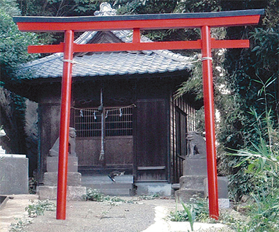 正面の社殿は瓦葺きの妻入りで、正面は両方への引き戸になっており、鈴を付けた長い紐がたれています。拝殿の上方に千社札が8枚貼られています。
