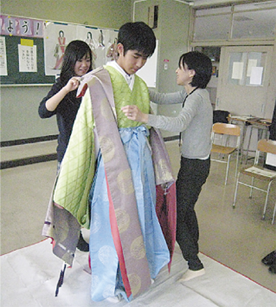 三浦臨海高校で先月18日、生徒による狩衣の着付け体験が行われた=写真。これは、生徒に古典を身近に感じてもらい、興味をもってもらおうと行われた特別授業。生徒は、2人1組で狩衣を着せる衣紋者(えもんじゃ)役も体験した。初めての体験に「背筋が伸びる思いがした」など反応も良好。生徒は、つかの間の古典世界に思いを馳せた。