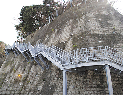 階段が設置されたのは、観光客などが利用する県営の城ヶ島駐車場前の高台。階段は、崩壊防止のためコンクリートで固められた高台斜面に張り出す形で設置された。東日本大震災以降、観光客が多く利用する駐車場の前で、近隣で働く従業員のためにも津波避難路の設置要望が市から県に出されており、今年4月から工事が進められてきた。