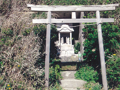 剱崎灯台の真下の海辺に「剱神社」は祀られています。「関東ふれあいの道、江奈湾へ1・7キロ」とある標識のすぐ近くの岩場に向かい合う形で社(やしろ)があります。『三浦郡神社由緒記』(昭和10年刊)によりますと「劍神社」(このように表記されています)の祭神は「大己貴命」(おおなむちのみこと)とあります。この神は「大国主神」(おおくにぬしのかみ)と同一で国作りの神として知られています。由緒は不明として、大正5年(1916)当時の指定村社であった「神明社」に合祀されたとあります。その後、この洞窟の前の祠は「龍神」として祀ったと言われています。