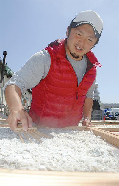三崎で唯一、しらす漁(湘南しらす)を行っている(株)君栄の宮川元彦社長(51・3代目)と息子の航さん(25・4代目)。今年も3月11日に漁が解禁。3年目を迎え「やっと道筋が見えてきた」と航さんは安堵の表情を見せる。後継者不足が深刻化している中、若い力が三崎に漲っている。