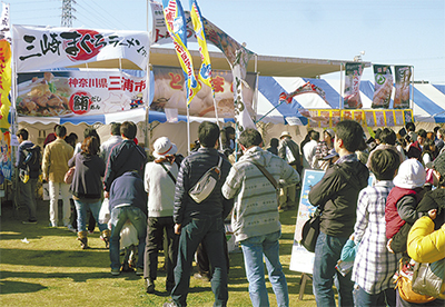 2日間で約8万人が来場した同会場。三浦市のブースでは「トロちまき」や「三崎のとろまん」、「三崎まぐろラーメン」などまぐろのまち三浦ならではの商品販売が行われた。ブース前には長蛇の列ができ、来場者は三浦のまぐろ料理を味わった。