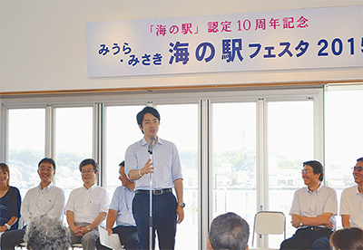 記念式典には吉田英男三浦市長や運営する(株)三浦海業公社の四宮利雄社長のほか、小泉進次郎内閣府政務官、地元県議・市議らが出席した=写真。吉田市長は「三方が海に囲まれたふさわしい立地。もっとPRして、道の駅を上回るようなものにしたい」とあいさつ。続いて登壇した小泉政務官も「海の駅に(産直センターやイベントスペースがある)道の駅の機能があるのはここだけ」と述べた上で、未だ認知度の低い点を課題とし「海の駅といえば三浦となるよう盛り上げていきましょう」と呼び掛けた。
