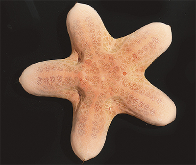マリンパークに隣接する東京大学大学院の三崎臨海実験所でも研究が盛んに行われており、今回の展示を監修協力。カワテブクロ=写真=・マンジュウヒトデ・アカヒトデ・ムラサキウニなど、約40種120点の棘皮動物の生体を展示。パネルでの解説や化石や殻、共存する生き物、最新の研究内容の紹介をしている。