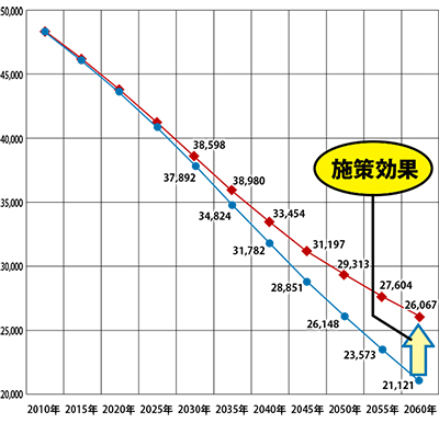 今年9月時点の市内総人口は4万5154人。1995年の約5万4000人をピークに減り続けている人口は今後も減少が続くとみられている。市の試算によると、2060年には現在の半分以下の約2万1000人になると予測されているが、創生総合戦略の施策効果で減少のペースを緩やかにさせ、2万6000人に抑制したい考え。