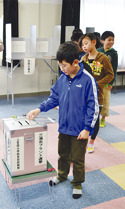 授業では実際に使用されている投票箱や記載台、開票用の計数機のほか、名簿対照係や投票用紙交付係を配置して教室内に投票所を再現。「三浦市ブランド選挙」と題し、市の名産品であるダイコン・キャベツ・スイカ・マグロの4種を立候補者に見立てて、模擬選挙を行った。本番さながら、児童らは事前に配布されたた投票所入場整理券を手に、受付けから投票までを体験した。