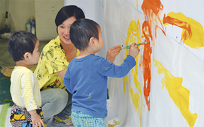 まちおこしを目的に同日開かれていた「MISAKIぐるぐる春まつり」内の一企画。三崎を拠点に絵画やイラスト作品の制作活動を行う画家の八木亮太郎さんとともに、参加した親子たちは四方の壁に貼られた真っ白な紙をキャンバスに見立て、絵の具やクレヨンなどを使って自由に落書きを楽しんだ。
