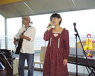 国道134号線沿い、目の前には三浦海岸が広がる立地から、夏には多くの海水浴客らで賑わう同店。平時における店舗活用と地域に密着した店づくりをめざし、3年ほど前から2階の飲食スペースをおもに音楽イベントの会場などに無料で提供する(申込み制)。幅広い世代が気軽に立ち寄れるファストフード店ということもあって、ファンや関係者に加えて偶然居合わせた来店客がライブを楽しみながら食事をする光景も珍しくない。申込みは随時受け付けており、後藤優介店長は「食事だけでなく、多くの人に利用してもらえたら」と話している。