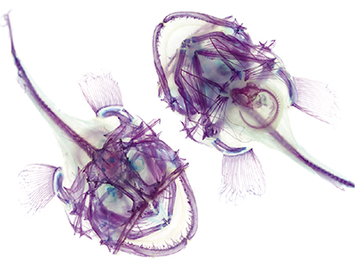 魚類や軟体動物、ヒトデをはじめとする棘皮(きょくひ)動物、クラゲやイソギンチャクなどの刺胞動物など、海に住むさまざまな生物の生態や進化の過程を骨の仕組みから探る同展。生体や標本が多数一般公開されるが、なかでも筋肉を透明化させ、硬骨を赤紫色、軟骨を青色に染色した「透明標本」は見もの。もともとは学術研究に用いられてきたものだが、光を当てると骨の一つひとつが細部まで透きとおり、そのアート性の高さから近年注目を集めている。