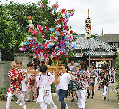 同祭では地区をい組・ろ組・は組の3つに分け、それぞれ町内を巡行。26日は地元中学生らが担ぐ子供神輿や、華やかに飾り付けられた小学生による榊神輿が威勢のいい木遣りの声とともに、家内安全や商売繁盛を祈願してにぎやかに住宅街を練り歩いた=写真。
