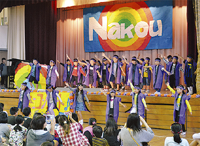 校内ではバザーや焼きそば・まぐろ汁などの模擬店が並んだほか、児童有志によるステージ発表も行われ、ダンスや合奏などを次々と披露=写真。息の合ったパフォーマンスで観客を魅了していた。