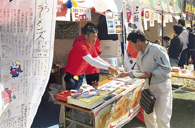 三浦のまちおこしに取り組む市民団体「三崎まぐろラーメンズ」は、先月29日・30日に熊本県熊本市で行われたイベント「KKT夢まちランド」に出展し、三崎まぐろラーメンを提供した=写真。