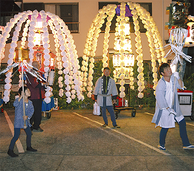 日没後には同寺の檀家をはじめ、近隣の延寿寺・円徳寺・大泉寺・本住寺などから講中が集まり、きらびやかに灯された万燈を引きながら団扇太鼓や笛でお囃子を奏でたり、纏(まとい)を振って周囲を練り歩いた=写真。