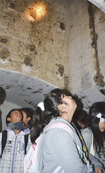 三浦市は今月9日、市立岬陽小学校(山田真也校長)6年生を対象とした戦争遺構見学会を県立城ヶ島公園で開いた。市内に残る戦争のあとを見ることで、社会科学習や平和について考える機会にしてもらおうと企画されたもので、児童30人は同公園の堀内美徳園長と、みうら観光ボランティアガイド協会の田中健介会長の案内のもと、園内に点在する砲台跡や観測所跡、弾薬や火薬を保管していた地下施設などをまわった。