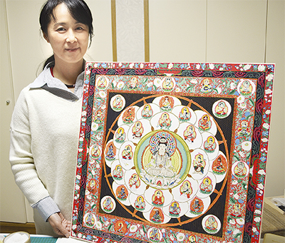 毘沙門在住の長谷川智(ち)彩(さい)さんは、この日本伝統の技を現代に受け継ぐ数少ない截金師の1人だ。紙や筆、3000種にも及ぶ絵の具、資料が所狭しと並ぶ自宅兼工房で日々作品づくりに精を出す。