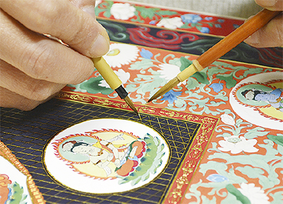 おもに手掛けるのは仏画や神画、曼荼羅などで、下絵から彩色、仕上げまですべて1人で行う。截金で使用する金箔も数枚を炭火で炙って焼き合わせたものを、手製の竹刀で1本ずつ均一に切り出す。作品によって必要な太さは異なるが、細いもので0・08㎜にもなり、1本の筆で金線を絡め、もう1本で糊を引きながら下書きなしで貼りつけていく。思わず呼吸を忘れてしまうほど繊細な作業の連続。大作になれば1つの作品に4〜5年費やすこともあるという。「やりがいを感じるのは、施主の喜ぶ顔を見た時。やってきたことが報われる瞬間ですね」