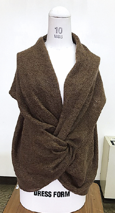 和服リフォームサークル「むつみ会」の深谷範枝さんを講師に、2枚の長方形の布を組み合わせ、スヌード(円環状のマフラー)としても使えるベストを製作する。