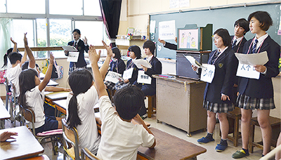 日ごろの発声や滑舌練習などで磨いた演技力を活かし、部員10人が熱演。部長を務める沖美晴さん(3年)は「感情を込めて伝えることができた」と振り返り、授業を終えた児童からは「万引きは悪いことだとは知っているけれど、思っていたより大きなことだと分かった」との感想があがっていた。