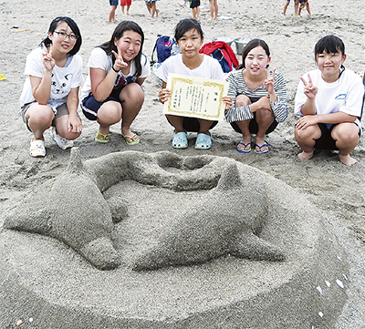 集まった18組90人は、「夢」をテーマに砂の像を制作。人魚や鳥、アニメのキャラクターから未来に漕ぎ出す船、貝がらで装飾した竜宮城、飛び出す絵本など個性豊かな作品を協力して作り上げ、出来栄えを競った。