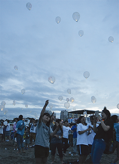 同日夕方からはLEDライトを装着した風船を使った「スカイランタン飛ばし」を開催し、約500人が来場した。参加者は風船に「家族が健康に暮らせますように」「世界平和」など思い思いに願いごとやイラストを書き、合図に合わせて一斉に空へ=写真下。放たれたランタンは風に揺れながらゆっくりと上昇し、薄暮の空に温かなあかりが灯ると周囲からは感嘆の声があがっていた。