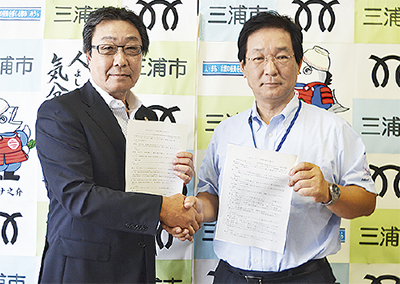 空き家バンク制度の円滑な運用を図るため、市は今月18日に神奈川県宅地建物取引業協会横須賀三浦支部と売買や賃貸借に関する連携協定を締結。物件の交渉・契約の仲介役を担う。同支部長の草間時彦さん=写真左=は「管理や活用のほか、空き家を未然に防ぐ役割もある。会員にも参加を呼びかけたい」と今後の展望を話した。