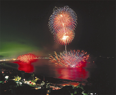 今年で37回目を数える三浦の夏の風物詩。打上数は約3000発で、「水中孔雀」と呼ばれる水中花火やスターマインなどが夜空と海面を美しく染める。