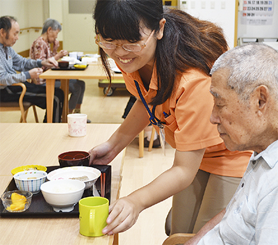 午後6時、食事を待つ特別養護老人ホーム入居者のもとへ、高校生たちが慣れた手つきでキビキビと配膳を始めた。介護福祉士やヘルパーなど専門資格を持たないため、おもに配膳・下膳、お茶出しや簡単な洗い物、傾聴などを担当。職員らをサポートする介護補助員(介護助手)として勤務している。