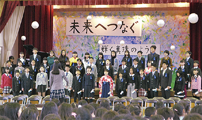 また、この日行われた式は「未来へつなぐ 輝く真珠のように」をテーマに進行。海を模した舞台装飾や卒業生による呼び掛けでは、「色や形が違うようにそれぞれの輝きを放ち、明日へ」など名向小ならではの門出の言葉が送られた=下写真。