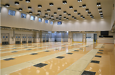 三崎漁港における冷凍まぐろの取引は、1日600本超。機能面では徹底した品質衛生管理と作業効率向上を両立した。スムーズな移動とまぐろに傷がつかないよう床面を平滑に塗装。陳列場の照明は、目利きへの影響を配慮して現市場と同等の見え方が確保されているという。