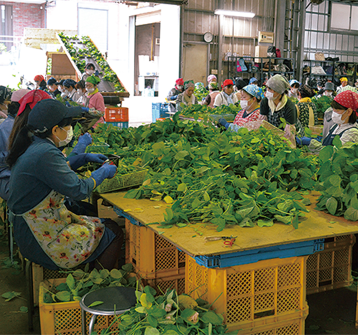 採ったばかりの枝葉付きの枝豆が次々と運び込まれているのは、津久井にある岩崎さんの作業所。5月中旬から選別や洗浄・袋詰めの作業が始まっている。7月末ごろまで短期パートの手を借り、多い日は100人以上が従事する。
