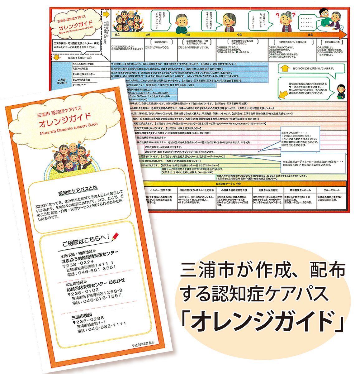 三浦市はこのほど、認知症の進行に応じた支援の手引き「オレンジガイド」(認知症ケアパス)を作成。市内で配架を行っている。適切なサービス利用の指針だけでなく、あらかじめ正しい理解を深めることで予防や早期発見、早期治療による重症化防止に役立てるねらい。
