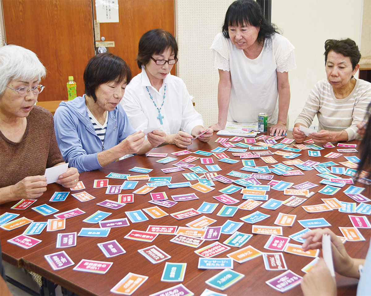 「誰か裁縫してくれる人いない?」「そのくらいなら私にもできるわ」「じゃあ、除雪はどう?」「年で力仕事はできないよ」―。日曜大工、除雪、入浴の介助、ゴミ出しなどと書かれたさまざまなカードのなかから、自分が周囲に頼みたいことを3枚選択。グループのメンバーに向けて助けてくれる人を探し、交渉成立をめざすというもの。