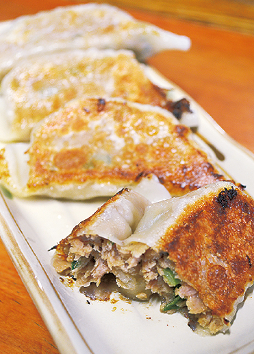 餃子のおもな材料は、まぐろのすき身とニラ、独自配合の調味料と企業秘密の隠し味。餡に使う野菜がまぐろの風味に負けて餃子らしさがなくなったり、水分量が難しかったり、冷めると硬くなる肉質などを克服しようと試行錯誤した。中華料理店の店主にアドバイスを仰ぎながら、ママの玲子さんと二人三脚で理想の味を探すこと1年半。周囲の太鼓判をもらい、晴れてメニュー入りを果たしたという。