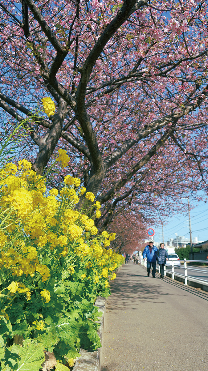 三浦海岸に早春を告げる河津桜が、今年も開花シーズンを迎えている。例年に比べて遅い開花で、三浦市観光協会の発表によると、今月19日現在で4分咲き。晴天に恵まれるとカメラを手に散策を楽しむ見物客でにぎわいを見せている。