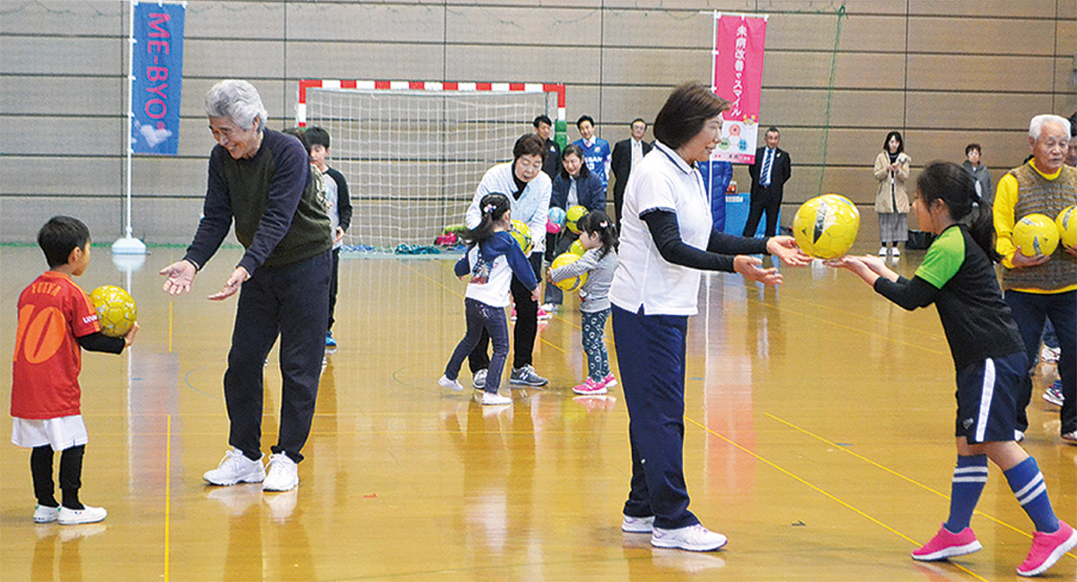 参加者は音楽療法士の指導のもと、童謡を歌いながら手足を動かしたり、脳トレを組み合わせた運動を体験。続いて、マリノスコーチによるサッカーボールを使ったトレーニングを行った=写真。プログラムでは、高齢者と子どもが2人1組になって取り組むものも多く、世代間交流も促進。参加者は「難しかったがいい運動になった」「自宅でも続けてみたい」などと感想を話していた。
