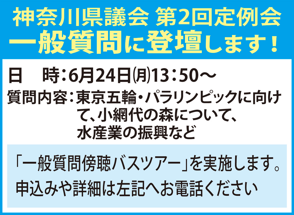 6月24日(月)の県議会第2回定例会の一般質問に登壇します。ぜひ傍聴にお越しください。質問の様子はインターネット中継でもご覧いただけます。