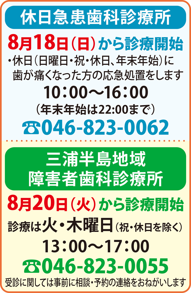 現施設の老朽化によるもので、移転に伴い、診察室の整備など機能面も強化される。JR横須賀駅・京急逸見駅から徒歩5分、駐車場も完備。同会が実施している障害者歯科については8月20日(火)から診療開始。