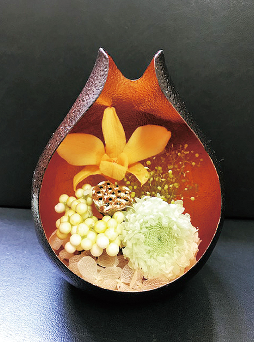 生花を特殊な液剤で加工し、半永久的に枯れない「プリザーブドフラワー」を使って、仏壇用の供花のアレンジメント(直径10cm、高さ12cm)をつくる=写真。講師は日本切花協会カットフラワーアドバイザーの秋元美枝さん。