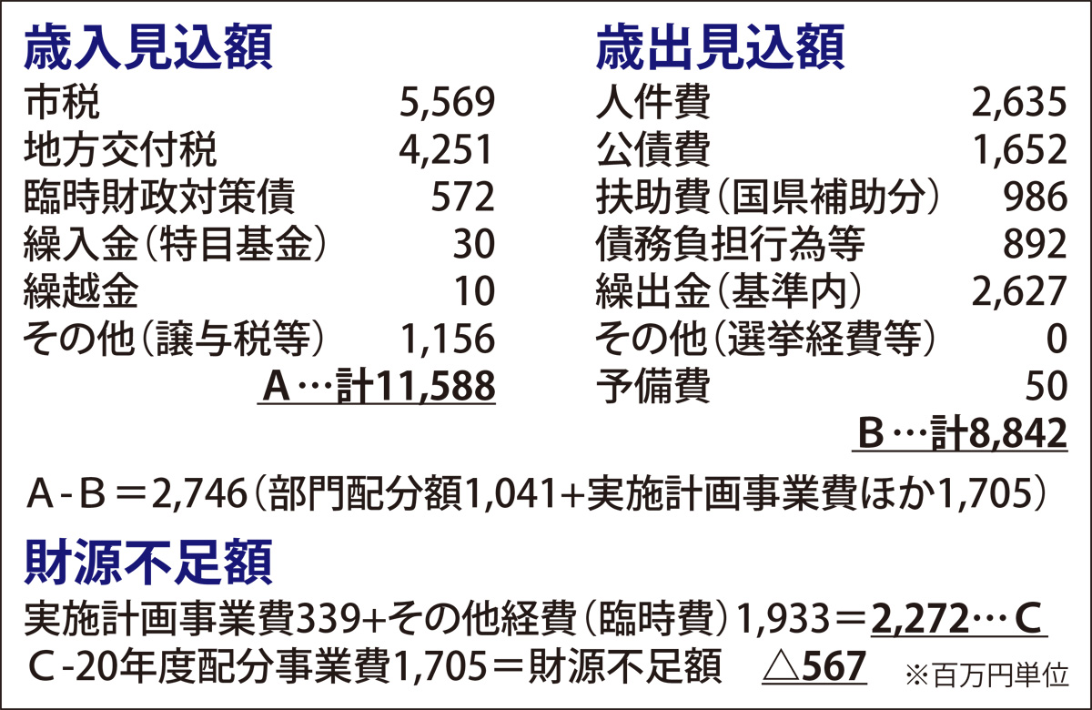 これら義務的経費の増大から、計画事業費に対する財源不足は、約5億7千万円と試算。19年度と比べて大幅に拡大しており、市は「例年以上に厳しい状況にある」として、人口減少や高齢化対策など、地域課題の解消と歳入確保・歳出削減へスピード感を持った継続した取り組みの必要性を示した。