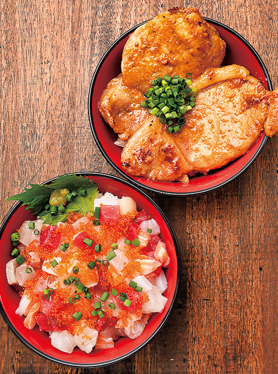今年創立30周年を迎える三崎朝市協同組合による「全国朝市サミット2019in三崎朝市」も同日開催。イベントの目玉は、味噌漬けの豚肉を香ばしく焼いた厚木名物「とん漬丼」と新鮮な海の幸たっぷりの三崎朝市「海鮮丼」の丼=同右=を各200食(1食1千円)限定で提供。また、東北や北陸などの地酒が並ぶ「名酒まつり」、熊本県の牛深朝市が海産物を販売する。物販では通常の朝市のほか、県立三浦初声高校による野菜、三浦市農協のドレッシングを直売(午前10時頃)。