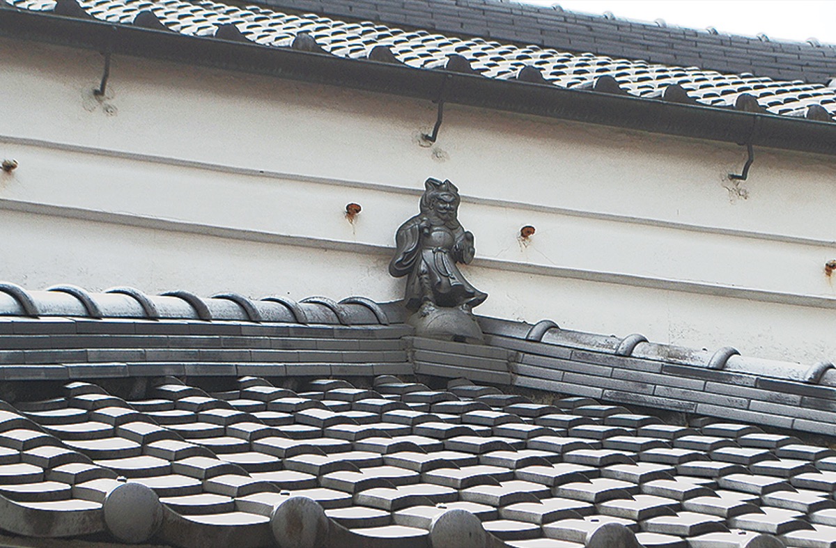 現在、手づくり作品を展示販売する「クラフトうみべ」として使われている旧永村履物店(三崎銀座通り商店街)。大正初期に建造され、重厚さが目を引く蔵造りの屋根に飾られている「鍾馗」=写真下=の像も、疫病神を除くと言われる魔よけの神を祀っているもの。日本では、疱瘡・天然痘除けや学業成就に効果があるとされ、邪気が侵入しないよう睨みをきかせている。