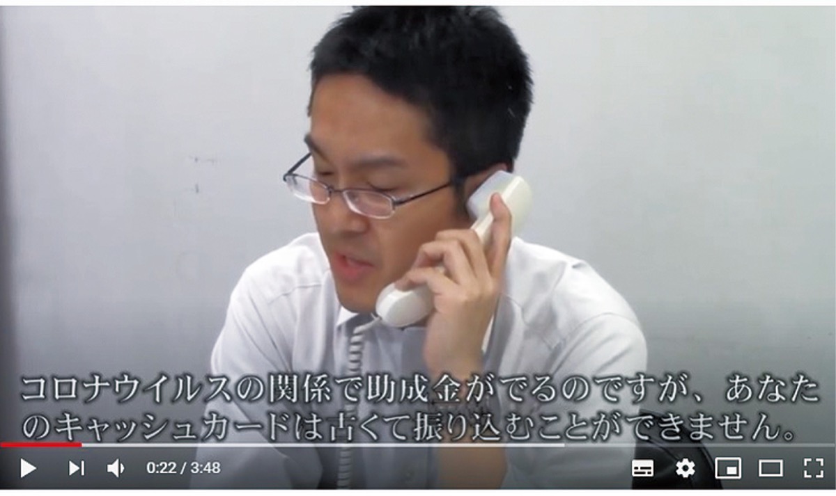 日、動画サイトユーチューブに「特殊詐欺手口紹介動画 電話でキャッシュカードと言われたらそれはサギ〜新型コロナウイルス便乗編〜」(約4分間)を公開。「コロナウイルスの関係で助成金がでるが、カードが古くて振り込めない」と語り、家に来た犯人にカードを渡して暗証番号を伝える様子を再現した。