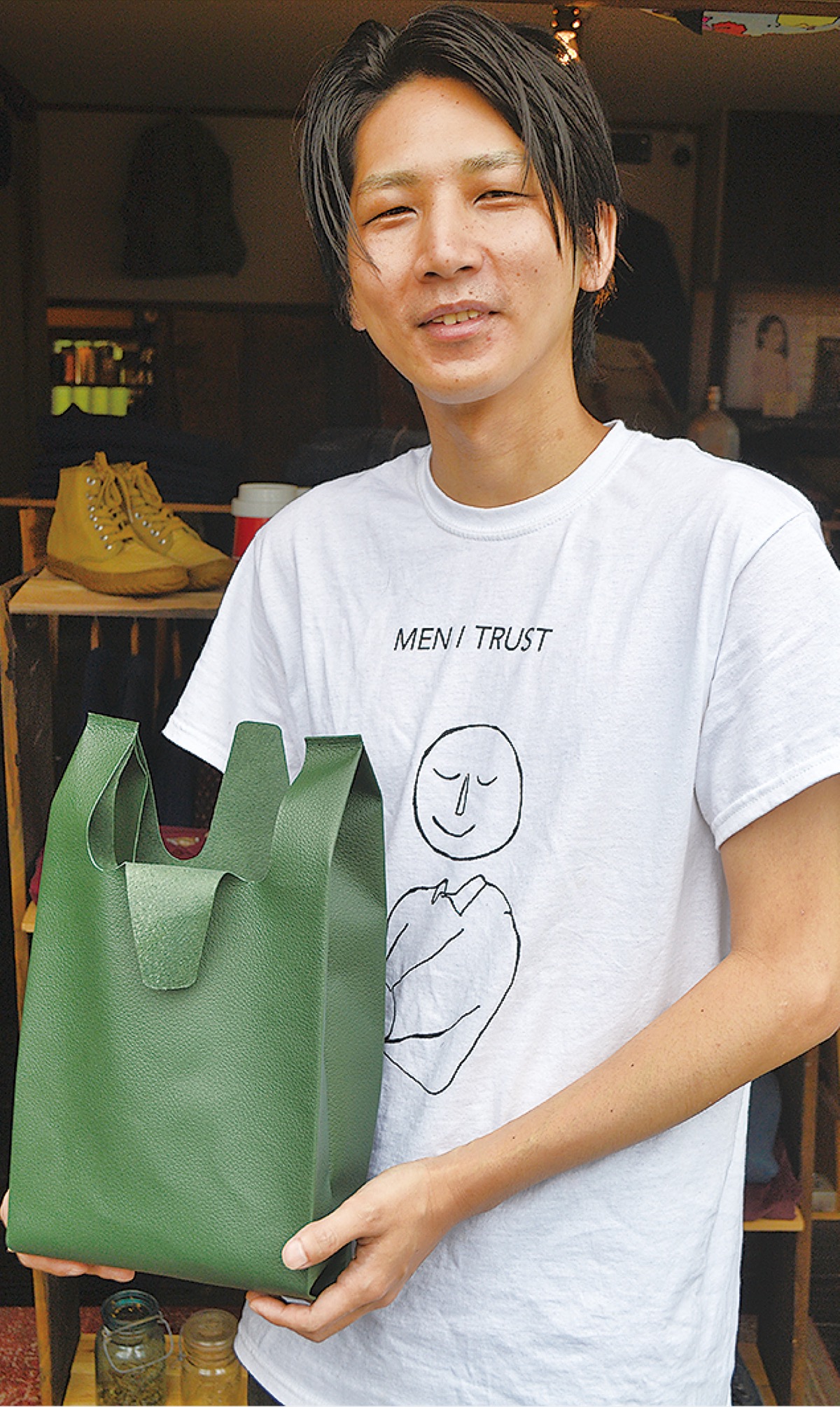 8年前に都内から移住し、「UNKOWN」のオープンは2017年。店舗では古着を扱い、革製バッグなどはインターネットを中心に受注販売し、1つずつ手づくりする。レジ袋有料化が話題にのぼり始めた1〜2カ月前から「コンビニエンスバッグ」の注文は、従来の1・5倍に増加。関心の高さと反響の大きさに驚きながらも、大量生産・大量消費・大量廃棄時代からの転換期を迎えた今だからこそ「物に愛着を持ってもらい、大事に使うことの大切さを伝えたい」と話した。
