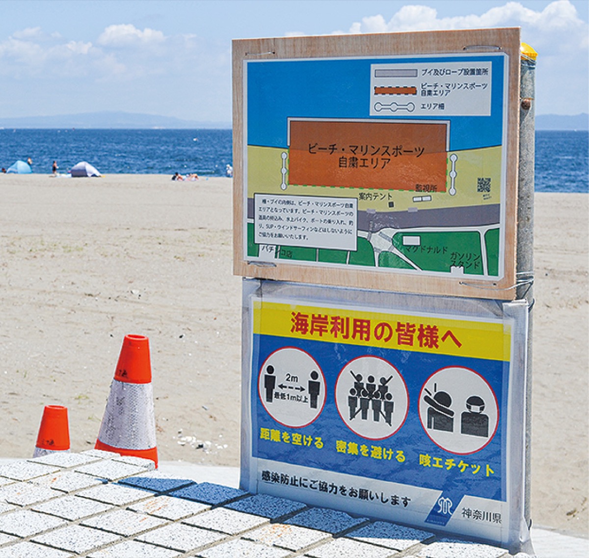 同海岸入口には、県が遊泳自粛や感染症対策などを促す看板を設置=写真下。そのほか、接触事故未然防止のため、ブイと柵を立て、水上バイクやSUP・ウインドサーフィンの乗り入れ、ビーチ・マリンスポーツができるエリアとのすみ分けを行い、来場者の安全を確保する。