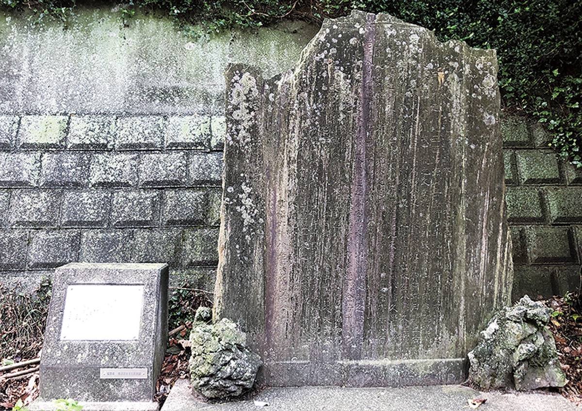 雪操(本名/尚賢)には村の名主という顔もあった。久里浜と野比をつなぐ尻こすり坂の開削を父の六兵衛から引き継ぎ、1884年に竣工。坂の途中にある記念碑=写真=は雪操の筆によるもの。このほか、地元の久里浜八幡神社社殿には「板墨画龍図天井」があり、2013年に、横須賀市の指定重要有形文化財となっている。